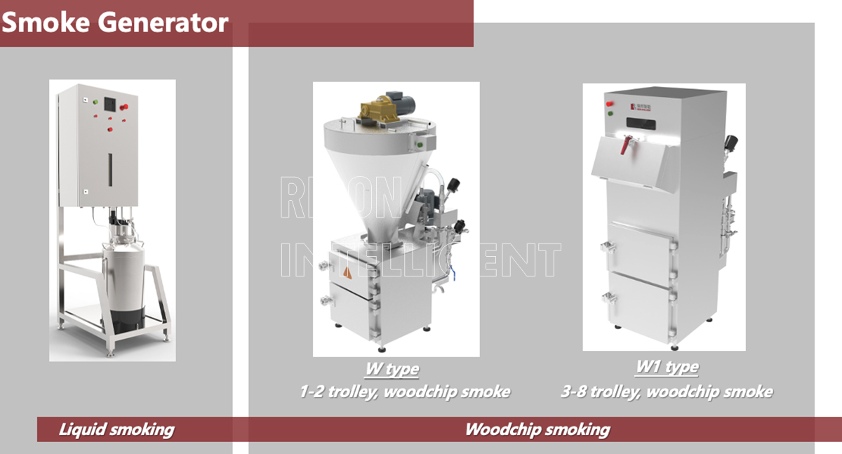 Generador de humo externo de virutas de madera con volumen/densidad de humo ajustable; La alarma contra incendios garantiza la seguridad, cumpliendo con las normas de maquinaria alimentaria. Atomizador de humo líquido opcional, sin emisiones y de fácil mantenimiento.
