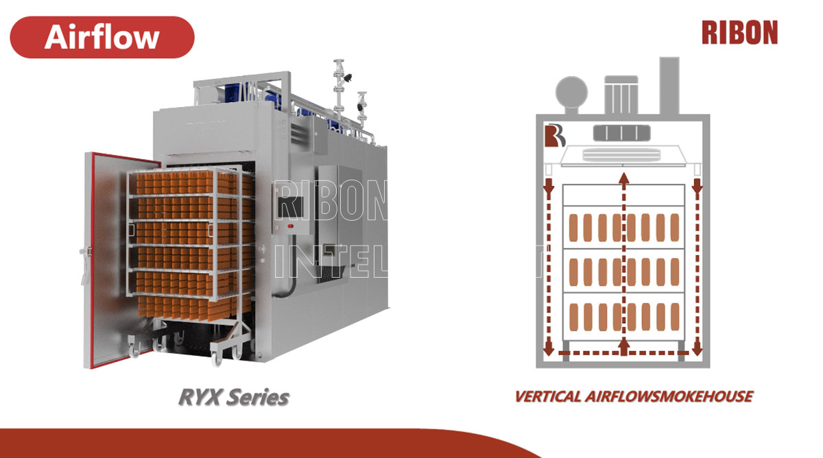 La exclusiva tecnología RUN-FLOW garantiza un flujo de aire vertical uniforme, estabilizando la temperatura y la humedad durante el procesamiento para garantizar un color y sabor uniformes del producto.