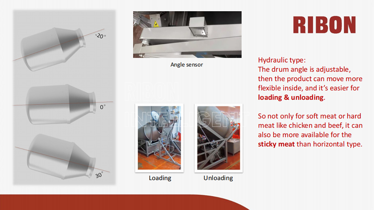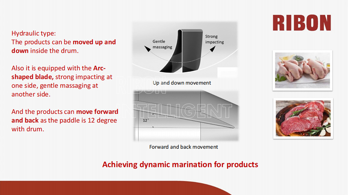 El tambor se puede ajustar a cualquier ángulo de inclinación de 0 a 20 grados para lograr un marinado dinámico. En el interior del tambor se encuentran soportes en forma de arco inclinados a 12 grados, que garantizan una excelente absorción de los marinados.
